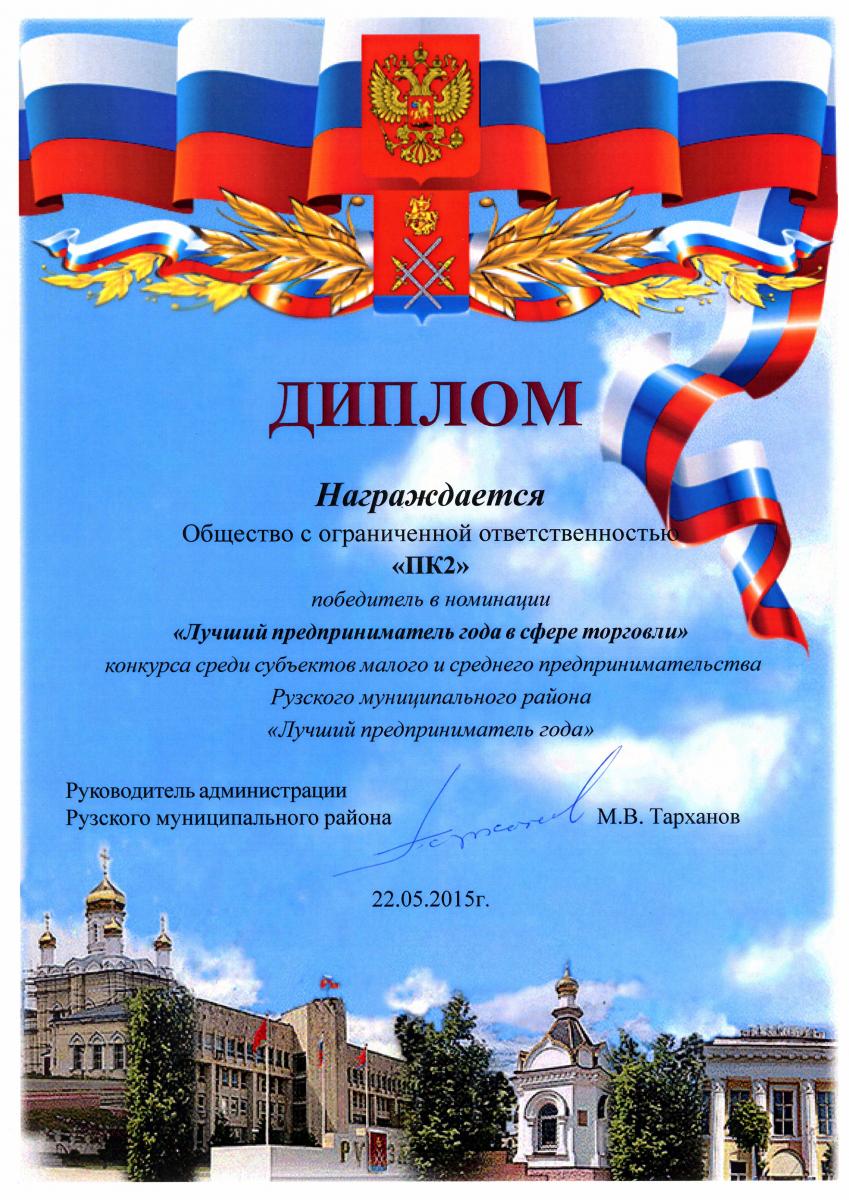 22.05.2015 года в Центре Культуры и Искусств г.Рузы состоялся конкурс среди субъектов малого и среднего предпринимательства Рузского муниципального района "Лучший предприниматель года". Участниками конкурса стало более 20 организаций. Наш Генеральный директор Зинькин Вячеслав Владимирович, как представитель интернет-магазина "ПК2" был номинирован и удостоен звания "Лучший предприниматель года в сфере торговли".
