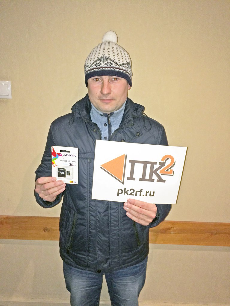 Интернет-магазин «ПК2» проводил акцию с розыгрышем микро SD-карты ёмкостью 32 ГБ (с адаптером SD в комплекте). Поздравляем победителей конкурса Максима Катышева из Шаховского и Ирину Соболеву из Рузы! Свои подарки они смогли забрать в пунктах выдачи покупок по месту своего жительства.