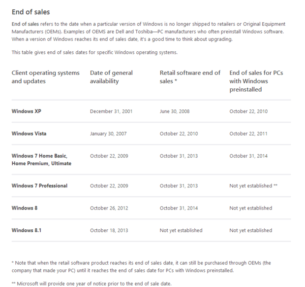 Ранее на этой странице отображалась операционная система Windows 7 в целом, без подразделения на различные её разновидности. Такая детализация теперь отображается по той причине, что дата окончания продаж компьютеров с предустановленной Windows 7 Professional остаётся неизвестной. Что касается продаж операционной системы Windows 7 в виде отдельного продукта, они были прекращены ещё четыре месяца назад.